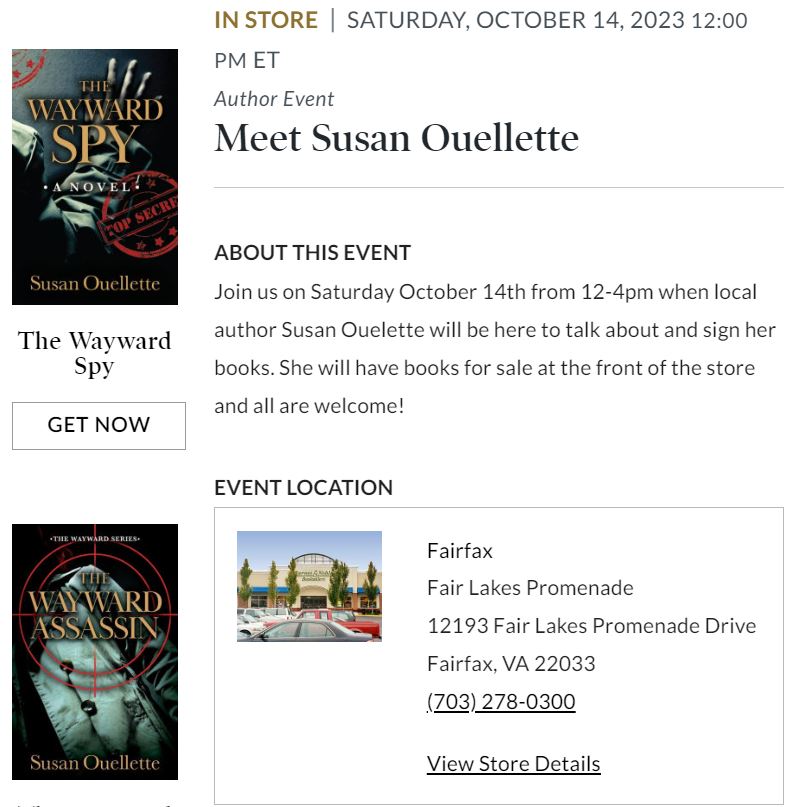 I’ll be signing my “Wayward” books at the Barnes & Noble in Fairfax, VA on Saturday, 10/14/23 from noon-4 pm. Stop by to say hello, grab a coffee, and buy some books,